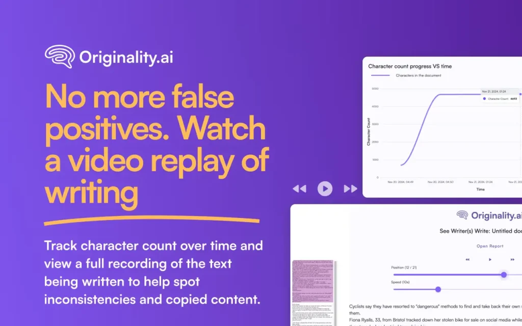 When downloaded, you can click the ‘Originality.ai report’ button at the top of any Google Doc to instantly gain access to a character-by-character replay of the writing process as it took place — providing full transparency.